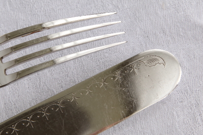 ![]() A&C16038-A: ナイフ:L20.5cm フォーク:L16.8cm / ¥8,600.-〔税込み・送料別〕 フォークやナイフの表面、エッジにキズが見られます。 |
