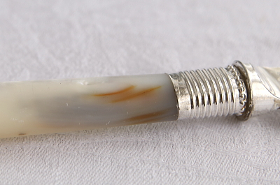 ![]() A&C16038-F:(ハンドルにヒビ、染み) ナイフ:L20.5cm フォーク:L16.8cm / ¥7,600.-〔税込み・送料別〕 フォーク、ナイフ共にハンドルにヒビ、シミが見られます。 |