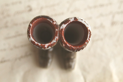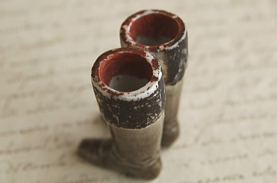 ★A&C16049 ポーセリンの小さなブーツ W4.2,D3,H5.5cm / ¥7,800.-〔税込み・送料別〕 送料:Aランク 【送料ページはこちら】 ◆ご注文方法はこちら◆ 妖精が脱ぎっぱなしで忘れていったのかなと、口元も緩む可愛らしさのミニチュアブーツ。釉薬のツヤが手入れした革のツヤを思わせる、灰褐色の渋い色みの1足です。履き口や内部には施釉されておらず、ツヤがないのは、起毛素材など表現したものかな、小さなサイズだけれど中が空洞なのでスピルベースや、水を入れてフラワーベースなどに使ったのかもなどと想像させてくれる不思議なブーツ。19世紀後期から20世紀初頭の、おそらくドイツ製だと思います。 ブーツは一体にくっついています。履き口にスレが幾らか見られますが、特に目立つダメージは見られません。 ミニチュアのティーポットや食器をご紹介しています。ページ下部のリンクからご覧ください。 |