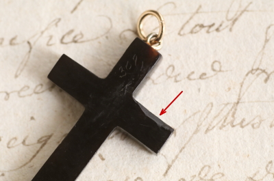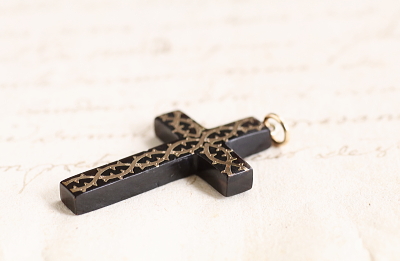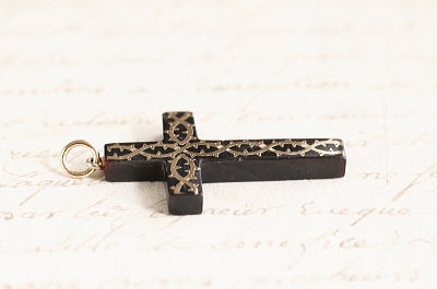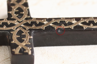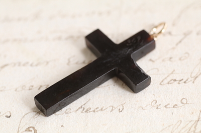 ★A&C16051 ピクウェのクロスペンダント 金の荊 23×39mm(丸カン含まず)(1.9g) / sold べっ甲 / ゴールド / 合金(丸カン) 送料:宅配便送料無料(3万円以上) ◆ご注文方法はこちら◆ 深く濃密な褐色に、独特の光沢を湛えるべっ甲に、金で荊の模様を象嵌された、ピクウェのクロスペンダント。細かな表現を競うような19世紀のピクウェ作品のなかでは、この洒脱で大胆な図案は新鮮。とうの昔に途絶えてしまった幻の技法と言われるピクウェ(piqué)はイタリアからフランスを経て、ユグノー派の職人とともにイギリスに伝わったとされる技法で、ヴィクトリア期のイギリスで、ロンドンやバーミンガムの職人の手によって高度に洗練された工芸です。直線的で整ったクロスのシルエットに、図案化された荊の模様が金で象嵌された、手の込んだ細工と洗練されたデザインが魅力のひと品。厚みが4ミリあるので褐色の色は黒に近い深みで、金象嵌を引き立てて、奥行きのある輝きが茨の上を流れる様子が美しい。19世紀のイギリス製。 角にごく小さな欠け、背部に欠けがありますが目立ちません。表面に小キズが見られますが、肉眼で気になるものではありません。チェーンは付属せず、ペンダントトップのみの販売です。 様々な素材、デザインのクロスペンダントをご紹介しています。ページ下部のリンクからご覧ください。 |