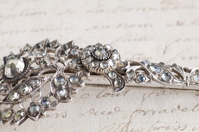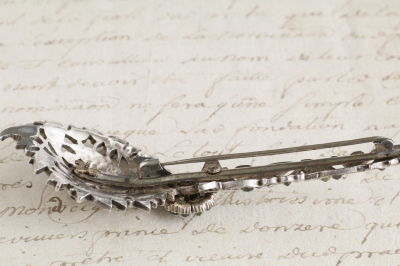 ★A&C16053 ローズカットストーン シルバーターバンピン W37,H95mm(24g) / ¥85,000.-〔税込み〕 天然石(ジルコンかクオーツ) / シルバー 〔品質保証書付き〕 送料:宅配便送料無料(3万円以上) ◆ご注文方法はこちら◆ 銀のレースが細密に切り抜かれ、ローズカットストーンがいっぱいに留められた豪奢なブローチ。この独特な形状は、ターバンに飾るためのジュエリーで、こちらは19世紀のインドで造られた品だと言われています。 丹念な手仕事で造られた、タガネやノコギリの痕跡が感じられる彫金の魅力的なレースに散りばめられた、ローズカットが施された宝石たちは、無色透明といっても、金色がかったものもあれば、青みがかった輝きの石も多く、一石一石が自由に輝く様は、19世紀初期のダイヤモンドジュエリーさながらにプリミティブな美しさを見せてくれます。 個性的なシルエットとディティールにどこか荒々しささえ感じる全長10センチの迫力あるボリュームは、ジャケットやコートの襟元に、男女問わず力強いワンポイントとして身に着けてほしい、話の種にもなる、他ではなかなか見掛けないユニークなブローチです。 ひとつ書き添えておきたいのは、ターバンピンとして使う場合はひょっとするとご紹介写真とは上下逆だったのかもしれません。異文化とは、簡単には解らないから、知っていく面白さがあるのですね。イギリスで購入。宝石のファセットに僅かなスレなど見られますが、肉眼で気になるようなものはなく、しっかりした、たいへんにきれいな状態です。 留められている宝石は、ガラスでなく天然石だと判明しており、天然ジルコン、もしくは、天然クオーツと推測されます。別途有償となりますが、宝石については、ご希望で専門機関の鑑別書を取得することも可能です。刻印などはありませんが、テスト済みのシルバー製。落下防止にシリコンストッパーをお付けします。 存在感のあるピンブローチなどをご紹介しています。ページ下部のリンクからご覧ください。 |