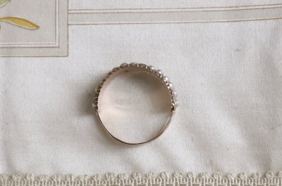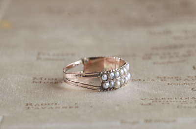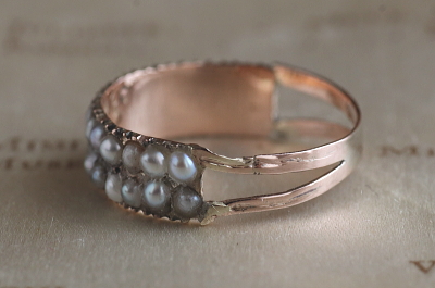★A&C16060 ジョージアン シードパールダブルライン ハーフエタニティーリング サイズ12.5号(1.1g) / sold 本真珠 / K8ゴールド 〔品質保証書付き〕 送料:宅配便送料無料(3万円以上) ◆ご注文方法はこちら◆ 直径2ミリに満たないささやかな輝きに古色の滲むシードパールを2列に30粒、ジョージアンのパールリングは一列でもかなり希少ですが、こちらは2重に並べられた大変珍しいハーフエタニティーの意匠です。 真珠養殖が始まる以前の、現代とは比べ物にならないほど真珠が希少だった時代の少しずついびつな天然真珠を並べて、淡く蒼みがかったものや、桃色のツヤを見せるものなど、かすかな彩と慎ましい輝きが、この時代の作品でしか味わえない、このうえなく贅沢なひと品です。 小さな粒を2つにカットして留めるハーフパールは、アンティークならではの精巧な技工で、やや赤みを感じる細身のゴールドシャンクにセットされ、フェイスの裏には流麗な飾り文字のイニシャルが刻まれた、繊細で丁寧な造りはジョージアンアンティークならでは。ホールマークはありませんが、19世紀初めの英国で愛された真珠の指輪です。 特に目立つダメージの見られない、しっかりした状態です。サイズ直しは有償にて承ります。お気軽にご相談ください。写真のアンティークケースは付属しません。 パールとダイヤやルビーなど、コンビネーションリングをご紹介しています。ページ下部のリンクからご覧ください。 |