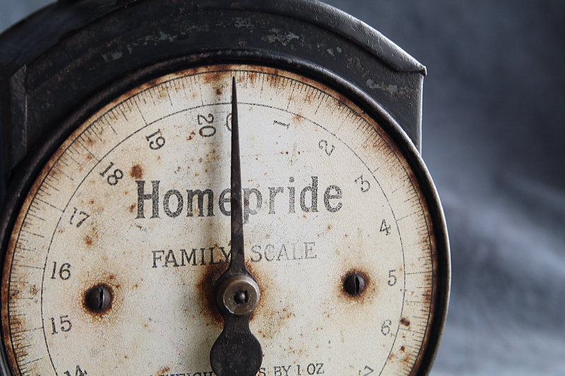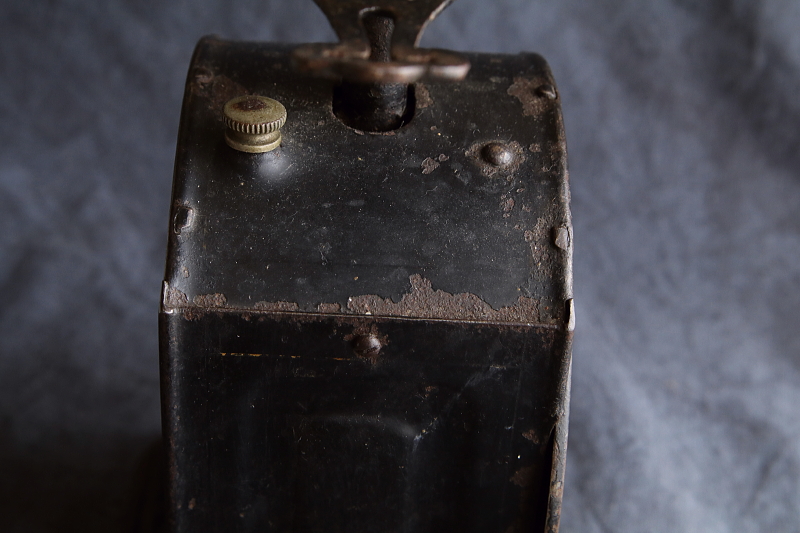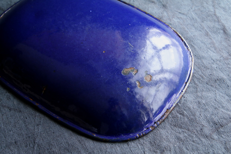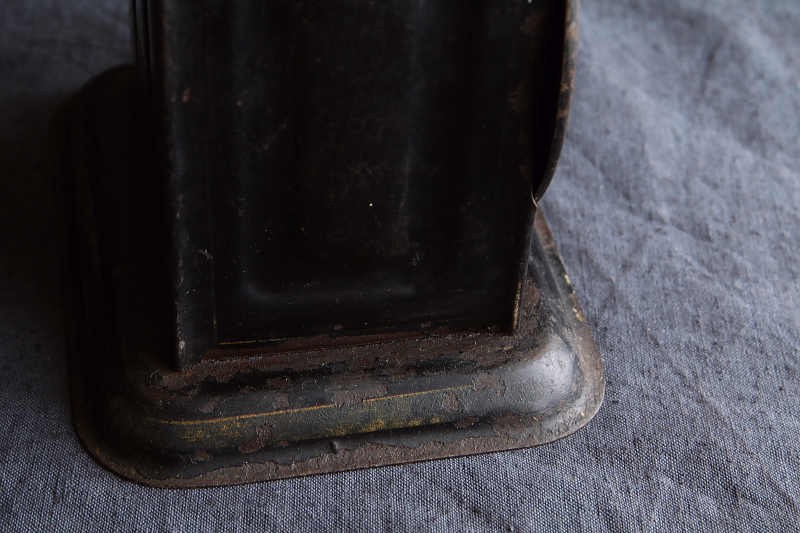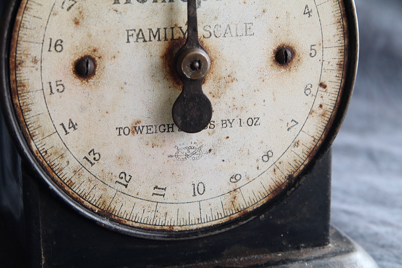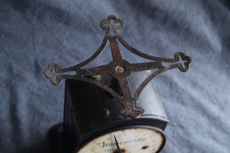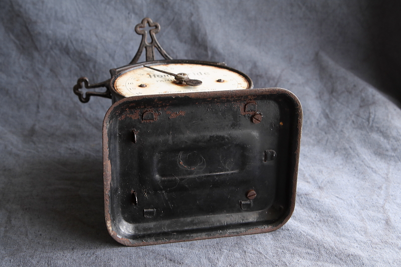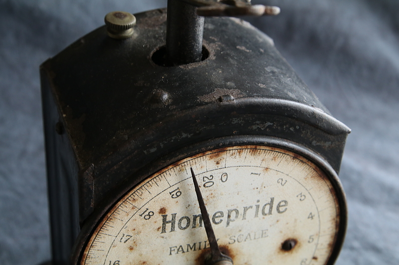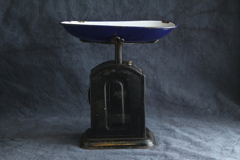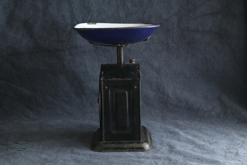 ★A&C16063 HOMEPRIDE アドバタイジングスケール ボディ:W17.5,D14.2,H24cm 上皿:W26.7,D19.5,H4cm / ¥65,000.-〔税込み〕 送料:宅配便送料無料(3万円以上) ◆ご注文方法はこちら◆ 今もイギリスで可愛いマスコット、フレッド君でおなじみの小麦粉メーカー、ホームプライド社のアドバタイジングのキッチンスケールです。小麦粉を量りやすそうな、琺瑯皿面の「HOMEPRIDE FLOUR」のロゴにも特別感が充分です。1930年代ごろの品で、そもそも数の少ないアドバタイジング。スケールと上皿どちらも残っているのは希少で、ホームプライドのスケールを見つけたのは、もう10年振りくらい?、いやもっと昔かも知れません。スケールの製造は、結び目のトレードマークがおなじみのSALTER社で、"FAMILY SCALE"の名前通り、家庭用のしっかりした造りはさすがで、今でも機械部分もしっかりしていて、針の動きもスムーズで、ポンド・オンス目盛りですが、だいたい正しく量れます。 長年働いてきた証でしょう、所々に見られるペイントの剥がれから覗く鉄味も好ましく、古みを感じさせつつ目盛りやロゴがしっかり残っている文字盤も魅力的。「HOMEPRIDE FLOUR」の黒い文字が目を惹く白い表側、ネイビーの裏側含めて、数カ所見られる程度で、琺瑯欠けが少ないのも嬉しいところです。針の動きもスムーズでポンド、オンス目盛りですが、機械部分もしっかりしていて、だいたい正しく量れます。 フレッドくんの絵柄のエプロンや、めずらしいスタイルの秤をご紹介しています。ページ下部のリンクからご覧ください。 |