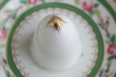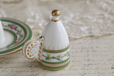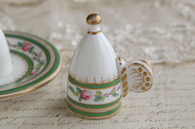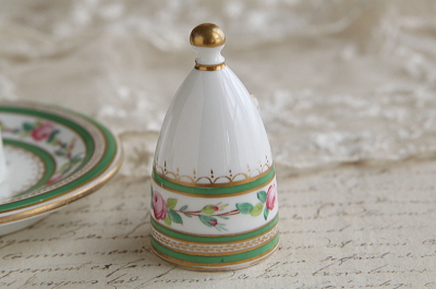 ★A&C16066 ハンドペイント キャンドルスナッファー Victorian W8.6,H6.5cm / ¥19,600.-〔税込み・送料別〕 送料:Aランク 【送料ページはこちら】 ◆ご注文方法はこちら◆ ボーンチャイナの白い肌に、グリーンのボーダーやピンクの薔薇が可愛らしいキャンドルスナッファー。ハンドペイントされた可憐な花の、香りに誘われた蝶が摘みになっており、ちょっとイモムシから成長しきれていないような、とぼけたお顔も可愛らしいです。19世紀、ヴィクトリア時代のイギリス製で、100年以上の時間を経てもなおきれいな状態で、おそらく未使用だと思います。 金彩にスレが幾らか見られますが、それ以外に目立つダメージの見られない、きれいな状態です。 ヴィクトリアンのハサミ型のキャンドルスナッファーなどご紹介しています。ページ下部のリンクからご覧ください。 |