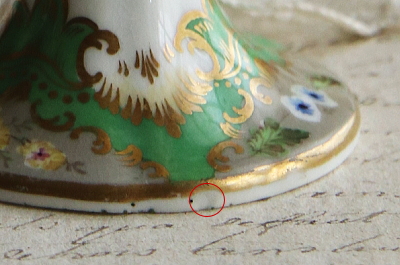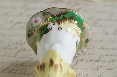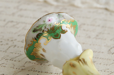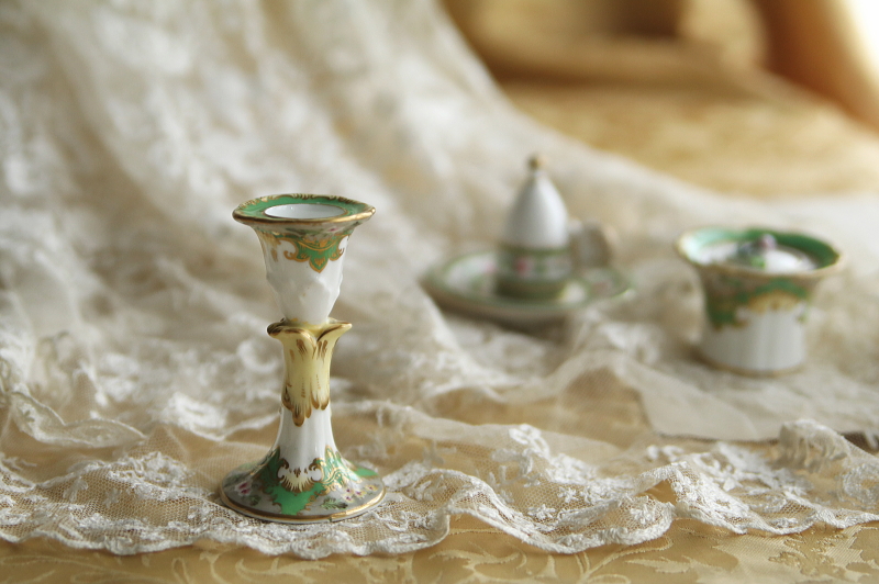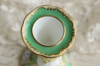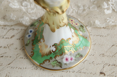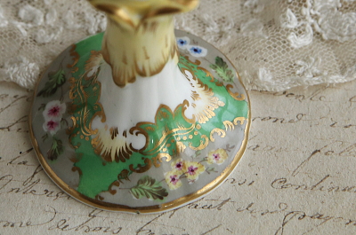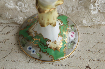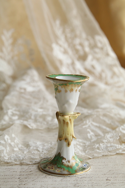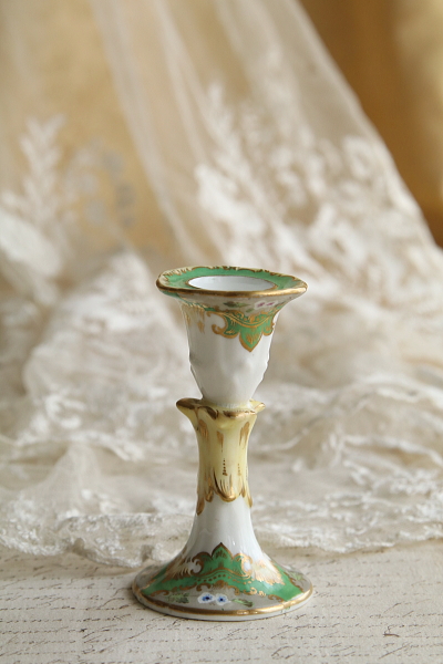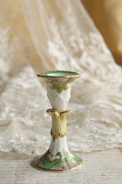 ★A&C16068 ハンドペイント ミニキャンドルスティック Victorian W5,H8.8cm / 送料:Aランク 【送料ページはこちら】 ◆ご注文方法はこちら◆ ボーンチャイナの白い肌に、英国好みのグリーンとクリームで彩り、小花や金彩もあでやかな、ハンドペイントの小さなキャンドルスティック。これほど可愛らしいキャンドルスティックなら、ロウソクの灯りも一層あたたかく魅力的に灯りそうです。19世紀、ヴィクトリア時代のイギリスから。 キャンドルの収まる穴の直径が、最大2センチで深さは3センチ。足元の縁にごく小さな薄い欠けが見られますが、目立たず気にならないと思います。 同シリーズのインクウェルや、様々なキャンドルスティックをご紹介しています。ページ下部のリンクからご覧ください。 |