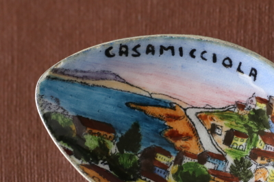 ★A&C16073 跳ね馬のスーベニールシルバースプーン CASAMICCIOLA L12cm(13.7g) / エナメル / 800シルバー 送料:Aランク 【送料ページはこちら】 定形外郵便対応【ご注文時にお申し付けください】 ◆ご注文方法はこちら◆ 跳ね馬が天辺に輝くシルバースプーン。ナポリのリゾート、カザミッチョラ・テルメのスーベニール。海辺の町を描いた、色鮮やかなエナメル彩がイタリアの空気を届ける、可愛らしいスーベニール。20世紀前期のイタリアから。 スプーンのエナメルにごく小さな欠けがありますが、目立たずほとんど気にならないと思います。それ以外はきれいな状態です。 スーベニールカトラリーや装飾的なスプーンをご紹介しています。ページ下部のリンクからご覧ください。 |
