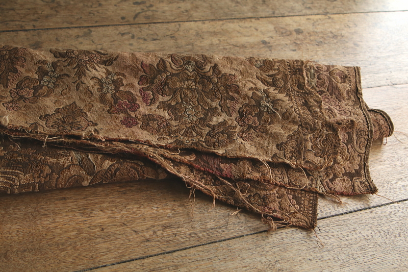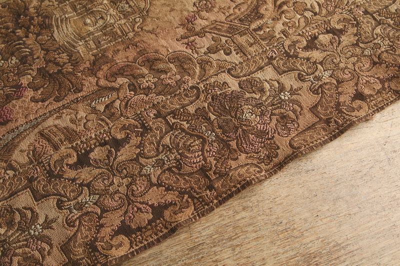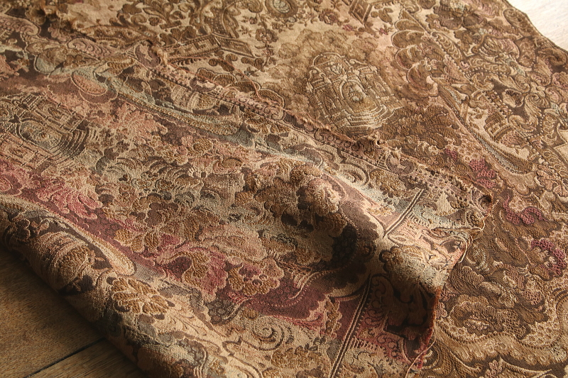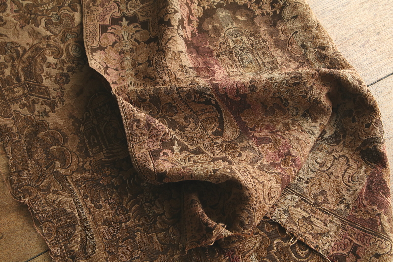 ★A&C16080 花のヴィンテージゴブラン 105×90cm / 送料:Aランク 【送料ページはこちら】 ◆ご注文方法はこちら◆ ニュアンスある発色の褐色の絵柄に、淡いピンクやブルーの花が、ほんのりと彩りを添えるゴブラン織り。3辺を切りっぱなしてもまだ、壁や家具を飾る織物として十分なサイズの一枚。素材としても面白い、20世紀中期のフランスのヴィンテージです。 1辺に折り返し始末。他の3辺は切りっぱなしです。穴や破れなどの目立つダメージは見られず、きれいなしっかりした状態です。 ゴブラン織りのカーテンなどをご紹介しています。ページ下部のリンクからご覧ください。 |