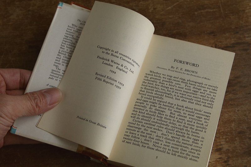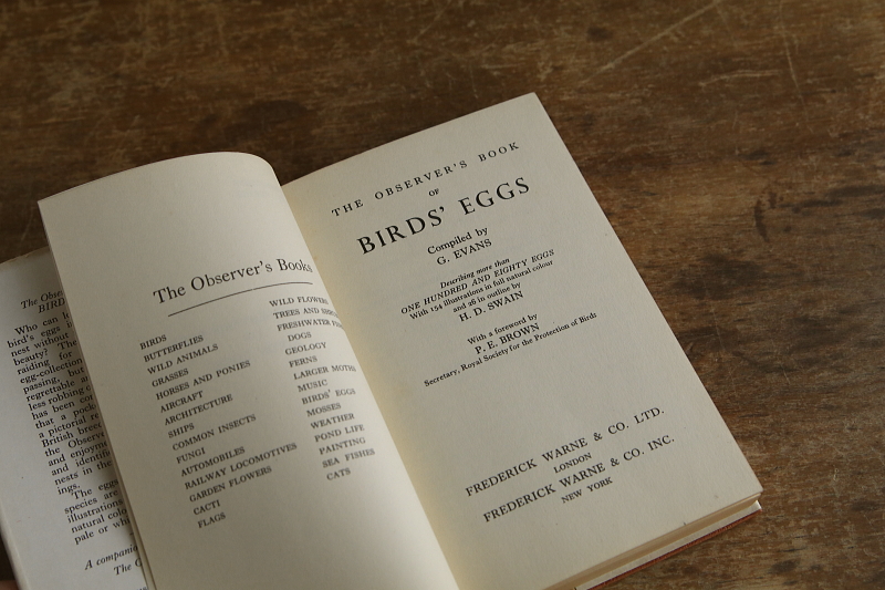 ★A&C16081 The Observer's Book BIRDS' EGGS / MUSHROOMS Toadstools A&C16081-A:(BIRDS' EGGS) 9.2×14.5cm / ¥7,600.-〔税込み・送料別〕 A&C16081-B:(MUSHROOMS Toadstools) 9.2×14.5cm / ¥6,600.-〔税込み・送料別〕 送料:Aランク 【送料ページはこちら】 ◆ご注文方法はこちら◆ イギリスの出版社、Frederick & Warneによるポケットサイズの小さな図鑑シリーズ、「The Observer's Books」からの2冊は、「BIRDS' EGGS」と「MUSHROOMS Toadstools」。鳥の卵とキノコ(毒キノコ含む)という、非常にそそられる題材を、カラーイラストもたっぷりと収録しています。コレクターも多いシリーズですが、本来子供向けの図鑑なので、カバーが残っているのは嬉しいところ。もっともカバーを外して現れる、型押しの装丁も可愛いので、小物の写真撮影などにも便利に使えそうで、こんなところも気に入っています。Aの鳥の卵は1959年の出版。Bのキノコは1978年の出版です。いずれも詳細には調べていませんが落丁などはなさそうで、きれいなしっかりした状態です。 蝶の図鑑ページや植物標本をご紹介しています。ページ下部のリンクからご覧ください。 |
