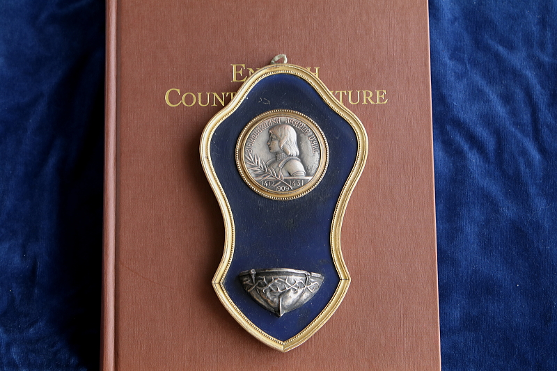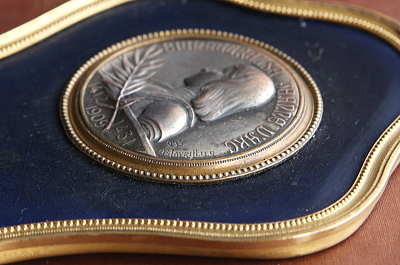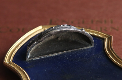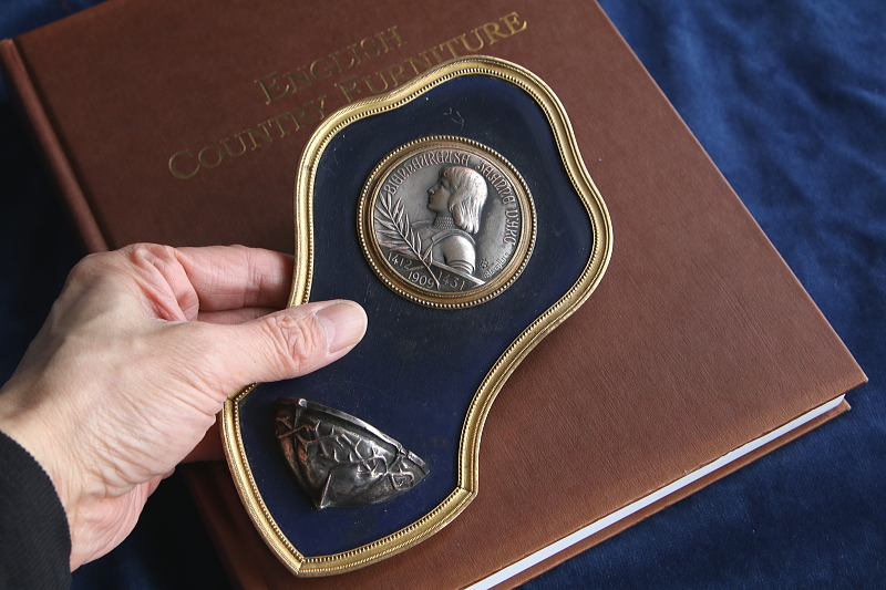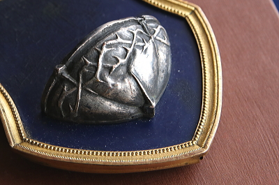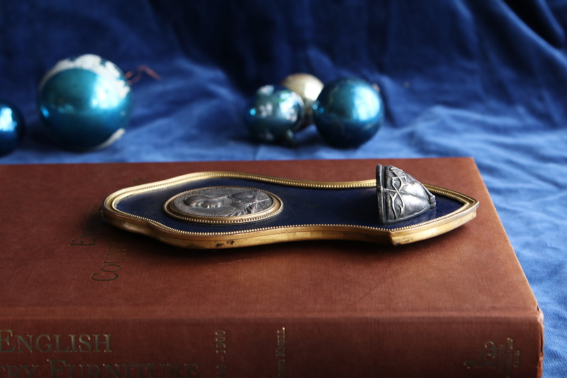 ★A&C16107 ジャンヌダルク 列福のメダルの聖水盤 W11,DD3,H19cm / ¥17,500.-〔税込み・送料別〕 送料:Aランク 【送料ページはこちら】 ◆ご注文方法はこちら◆ 甲冑を身につけた、聖ジャンヌの凛々しい横顔。見つめる視線の先に、何が見えているのか、悲劇を知る者として気にかかります。メダルの生没年の下に1909と有るので、1909年の列福さを記念した聖水盤のよう。メダルを飾る木製ベースの、深い藍色の塗装と、金色のメタルの縁取りとのコントラストが美しい。古い塗装にはヒビ割れが見られる、経年の表情も好ましいひと品。裏板はネイビーの半透明の素材で、見えないところも美しく仕上げられています。1909年の列福から1920の列聖までの品と思われます。フランスから。 他にもジャンヌダルクのアンティークや、聖水盤をご紹介しています。ページ下部のリンクからご覧ください。 |
