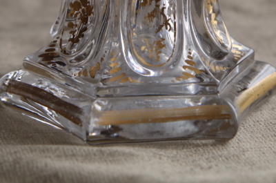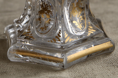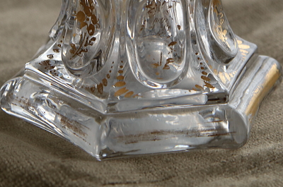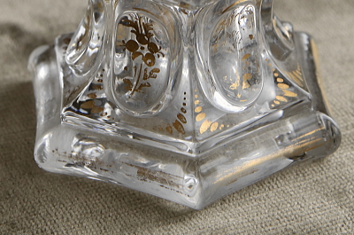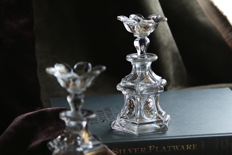 ★A&C16120 ヴィクトリアン 花のパフュームボトル A&C16120-A,B共: W8.3,D7,H14cm / 各¥22,500.-〔税込み・送料別〕 送料:Aランク 【送料ページはこちら】 ◆ご注文方法はこちら◆ 花のようなストッパーが華やかなガラスのパフュームボトル。ヴィクトリア時代の古いボトルで、ストッパーが残っていることも希少ですが、これほど華麗なデザインであれば出会いの感動もひとしおです。モールドで厚手に作られ、ハンドカットや金彩で整えられて、光に浮かび上がる凛としたシルエットが魅力的なひと品です。19世紀のイギリスから。 金彩にスレが幾らか見られますが、特に目立つダメージは見られません。裏から見ると底に曇りが見られますが、それ以外はガラスの状態もきれいです。 様々なパフュームボトルをご紹介しています。ページ下部のリンクからご覧ください。 |