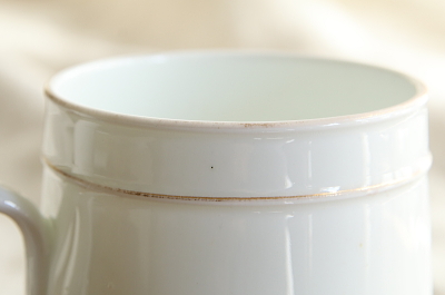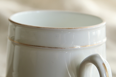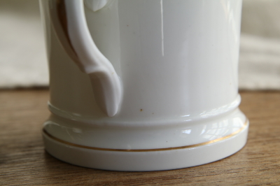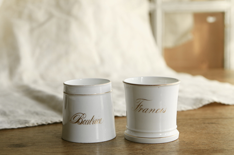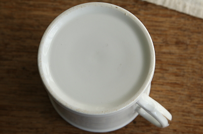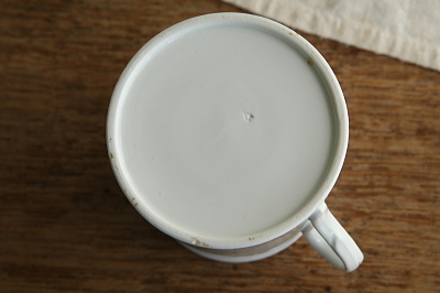 ★A&C16126 ヴィクトリアン ボーンチャイナマグ A&C16126-A(Beatrice): W10,D8,H8.3cm / ¥15,000.-〔税込み・送料別〕 A&C16126-B(Francis): W10.8,D8.3,H8.4cm / ¥12,000.-〔税込み・送料別〕 送料:Aランク 【送料ページはこちら】 ◆ご注文方法はこちら◆ 金文字で「Beatrice」と「Francis」の名が記された、ボーンチャイナのマグ。陶器よりも透明感があり、より滑らかだかけれど、磁器よりも温かみを感じる白い肌に、擦れた金彩の軽みを感じる縁取りのラインとレタリング。花を艶やかに手描きしたものが多いなかで、この率直な装飾にハッとさせられる。口がすぼまったAと広がったB、同じ窯の物だと思われるが、異なるシルエットは、どちらも垢抜けていて、完成されている。19世紀英国製。 Bに表面と内部に浅いひびがありますが、それぞれ反対側には抜けていません。他には金彩にスレが見られる程度で、きれいなしっかりした状態が嬉しいです。 マグやコーヒーカンをご紹介しています。ページ下部のリンクからご覧ください。 |