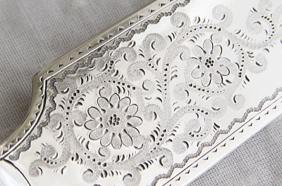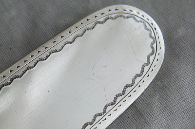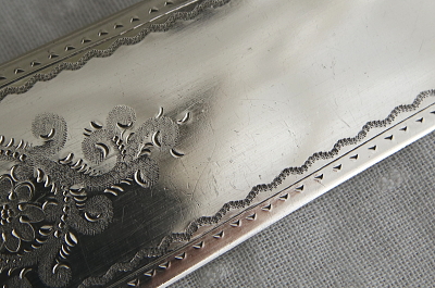 ★A&C16129 花のエングレーヴィングのケーキサーバー "Walker & Hall" W3.7,L26.8cm(145g) / 送料:Aランク 【送料ページはこちら】 ◆ご注文方法はこちら◆ サーバーとナイフの中間のような、細身のシルエットがめずらしい、シルバープレートケーキサーバー。両面に花の模様をエングレービングで描き出す、手の込んだブレードに、中空のハンドルで、持ち重りも心地よい、手にするだけで特別な食卓を想起するひと品です。イギリスの著名なシルバースミス、Walker & Hallによるもので、さすがの作りの良さを感じます。レジスタードナンバーから1894年頃の品とわかる、イギリス製。 ブレード、ハンドルのシルバープレート表面に小キズ、ハンドルの側面などにごく小さな浅い凹みが見られますが、ほとんど気にならない程度だと思います。全体にしっかりしており、時代を考えればきれいな状態で残っています。 ブレードとハンドルをニカワで接着していると思われます。湯水に長時間浸けたり煮沸すると、ニカワが溶けますので注意して下さい。食洗機不可。 ケーキナイフ、ケーキサーバーをご紹介しています。ページ下部のリンクからご覧ください。 |