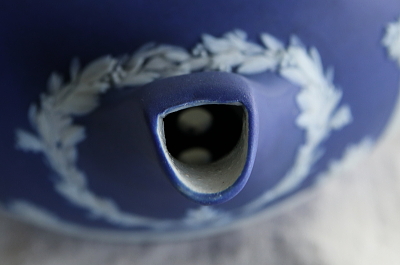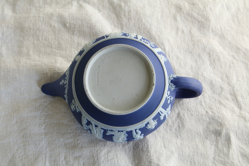 ★A&C16130 ジャスパーウェアティーポット WEDGWOOD W21.5,D14,H12cm / ¥32,000.-〔税込み〕 送料:宅配便送料無料(3万円以上) ◆ご注文方法はこちら◆ 時代を感じさせる深い藍の肌に、幻想的な神話の世界が白く浮かび上がる、ジャスパーウェアのティーポット。厚く焼き締めたずっしりと重い炻器に、立体的で精緻なレリーフを施した、たとえウエッジウッド製でも20世紀の製品とは一線を画すアンティークジャスパーウェアです。取り回しが良く、日常的に贅沢な時間を共に過ごせそうなサイズ感も好ましい、ジャスパーウェアの元祖WEDGWOODの1900年頃の作品です。 容量は600ml程。水切れ良し。ほんの僅かにレリーフの欠けなどがありますが、状態良く残る19世紀の陶器のティーポットなんて、市場でもほぼ皆無ですので、非常に現実的な選択です。 内部はクリーニング済みで、うっすら染みが見られる程度です。蓋の摘みの中心の白い盛り上がりが、欠けて平らになっていますがあまり目立ちません。蓋の裏側にごく小さな欠けが数ヶ所見られます。レリーフに小さな欠けが1ヶ所ありますが、よく見ないと分からない程度です。 他にもジャスパーウェアをご紹介しています。ページ下部のリンクからご覧ください。 |