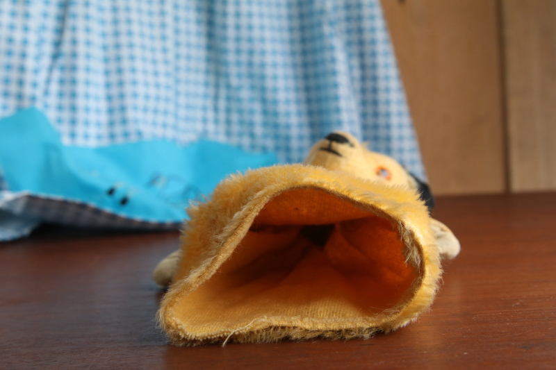 ★A&C16146 SOOTYのパペット T22cm / ¥16,800.-〔税込み・送料別〕 送料:Aランク 【送料ページはこちら】 ◆ご注文方法はこちら◆ 黒いお耳の愛らしいクマのキャラクターは、イギリスの子供達の人気者。1950年代のテレビ、「スーティーショー」に登場したパペットのスーティーそのままの姿を愉しんだのでしょう、少しくたびれた風情のパペットです。ちょっと左右不揃いやプラスティックアイ、頭部のモヘアやレキシンパッドの剥げ、首のくたっとしたやわらかさなど、子どもたちといっぱい遊んだ幸せな表情が可愛らしい。ラベルが無くなっていますが、おそらくチャドバレーの品だと思います。1950~60年代頃のイギリスから。 頭部や手などにモヘアの剥げが見られますが、強度的にしっかりした状態です。写真では中に詰め物をして立たせています。立たせるのに少々コツが必要です。 色々なテディベアなどぬいぐるみをご紹介しています。ページ下部のリンクからご覧ください。 |