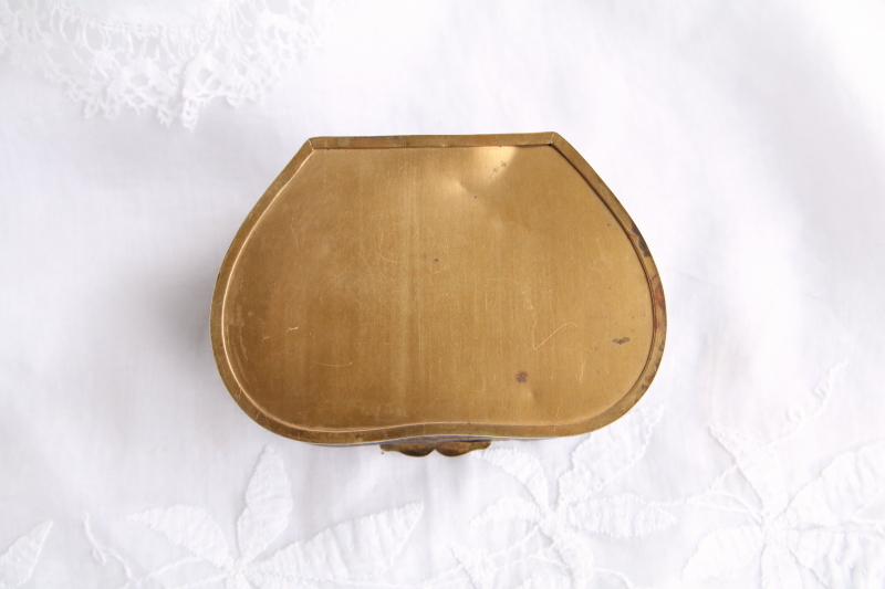 古式ゆかしい衣装を纏う、まだあどけないとも言える顔立ちの可憐なご婦人が、陶板にハンドペイントされたジュエリーボックス。ミニアチュールの柔らかな色使いが、貴金属ではないけれど、アンティークならではの古色を纏い、古典的なレリーフが浮かび上がる、真鍮の深い輝きによく似合います。内部のネイビーの内張りもまだまだきれいな状態です。1900年頃のフランスから。