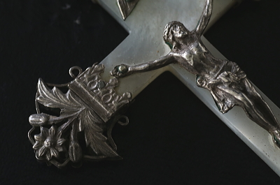 ★A&C16188 プルミコミュニオン クロスペンダント シルバー&マザーオブパール 54×81mm(バチカン含まず)(11g) / ¥27,600.-〔税込み・送料別〕 800シルバー / マザーオブパール 送料:Aランク 【送料ページはこちら】 ◆ご注文方法はこちら◆ マザーオブパールの深みある光沢と、シルバーの硬質な輝きのコントラストに照らされて、十字架のイエス様の精緻な陰影が神々しい。大ぶりなクロスペンダントに細やかに表現された、イエス様の表情や枝先の花模様など、重厚ながら繊細な造形が魅力的で、これならば天のご加護もしっかりと受け止めてくれそう。渋みを含んだ銀光にも癒やされそうなひと品は、プルミエコミュニオンで贈られた物。裏面の手彫りの書き込みから、1936年より以前のフランスの品と分かります。特に目立つダメージの見られない、きれいなしっかりした状態です。 ネックレスチェーンは付属せずペンダントのみの販売です。写真のケースは付属しません。 様々な素材、デザインのクロスペンダントをご紹介しています。ページ下部のリンクからご覧ください。 |