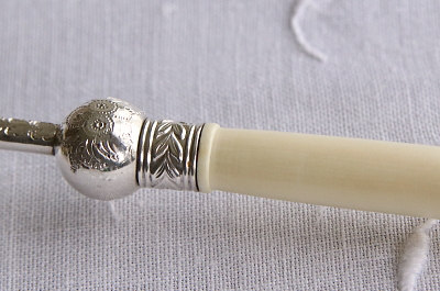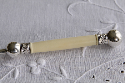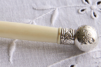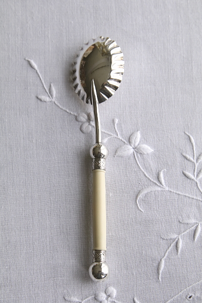 ★A&C16192 アイボリーハンドルのサービングスプーン Victorian L17cm / 送料:Aランク 【送料ページはこちら】 ◆ご注文方法はこちら◆ 縁が波打つボウルにはゴールドギルドが施された、シルバープレートのサービングスプーン。ボウルからハンドルまで、ハンドエングレービングで模様を刻まれて、金と銀、何れの輝きもよりまばゆい、手仕事の温もりも魅力的なひと品です。象牙の硬質で滑らかな手触りを、手にするだけでも豊かな気持ちにさせてくれる、ヴィクトリアンのサービングスプーン。100年以上も昔のスプーンながら、ゴールドギルドがきれいに残っているのは嬉しいところ。19世紀のイギリスから。 ボウルの裏などシルバープレート表面に小キズがいくらかみられる程度で、特に目立つダメージの見られない、きれいなしっかりした状態です。ハンドルをニカワで接着していると思われます。湯水に長時間浸けたり煮沸すると、ニカワが溶けますので注意して下さい。食洗機不可。 華やかなサービング用のカトラリーをご紹介しています。ページ下部のリンクからご覧ください。 |