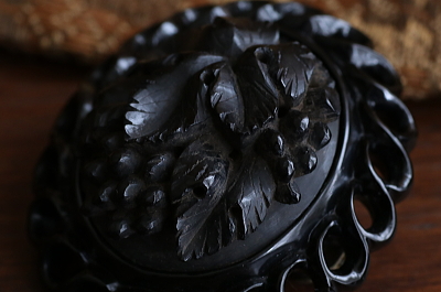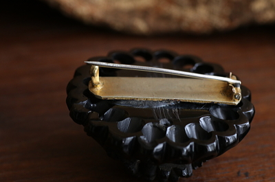 ★A&C16213 葡萄のジェットブローチ Victorian W44.5,T21,H49mm(金具含まず)(19.4g) / sold ジェット / 真鍮 〔品質保証書付き〕 送料:宅配便送料無料(3万円以上) ◆ご注文方法はこちら◆ せっかくアンティークジェットを身に着けるなら、ひとつは持っていたい、ヴィクトリアンらしいボリュームのある本格派のブローチ。ゴロリとした黒の塊に、緻密に彫刻した葡萄はつや消しで、磨き上げたレース状の縁取りとの2層からなるコントラストも見どころです。ヴィクトリア時代にモーニングジュエリーとして流行した、大人のための贅沢なマテリアルを彫刻したブローチは、厚みが2センチと時代を映す重厚感ですが、流木の化石であるジェットは存外軽く、服の素材もジャケットやコートから、カジュアルな装いまで愉しめます。19世紀、ヴィクトリア時代の英国製。 ブローチ金具が付け替えられた痕跡があります。背面角に薄い欠けが2カ所見られますが、表からは分かりません。特に目立つダメージの見られない、きれいなしっかりした状態です。落下防止にシリコンストッパーをお付けします。 ジェットやボルカナイトなどの黒いジュエリーをご紹介しています。ページ下部のリンクからご覧ください。 |