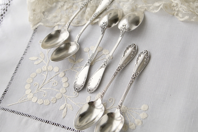 ★A&C16250 蔓花のティースプーン・ペア A&C16250-A~C共: L14.5cm(30g) / ¥6,800.-〔税込み・送料別〕(ペア価格) 送料:Aランク 【送料ページはこちら】 ◆ご注文方法はこちら◆ ハンドルの表裏に絡みつくような蔓花のレリーフが、シルバープレートの光沢に浮かび上がるティースプーンを、2本1組でご紹介。ボウルの裏にも花をあしらって、ますます輝きも愛らしく思える、20世紀初頭のフランス製。しっかりした厚みや持ち重りも頼もしい、100年近くも昔からお茶の時間を盛り上げてきたカトラリー。経年の曇りや小キズで落ちついた輝きです。華やかなレリーフには、これぐらいの光沢が上品に思え、当店でポリッシュはしていません。 シルバープレート表面に小キズがいくらか見られますが、全体にきれいなしっかりした状態で、シルバープレートの摩滅などは見られません。 華やかなレリーフのティースプーンをご紹介しています。ページ下部のリンクからご覧ください。 |