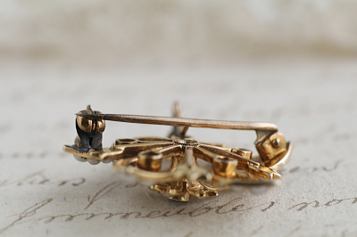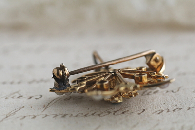 ★A&C16251 デマントイドガーネット&パール フラワーペンダントブローチ 27.5×28mm(4.6g) / ¥176,000.- 〔税込み〕 天然ガーネット / 本真珠 / K14~16ゴールド(フレーム) / K9ゴールド(ピン、フック) 〔品質保証書付き〕 送料:宅配便送料無料(3万円以上) ◆ご注文方法はこちら◆ シードパールのグラデーションが縁取る、ゴールドフレームの愛らしいフラワーペンダントブローチ。ハイカラットゴールドのリッチな輝きの花姿に6石、鮮やかなイエローグリーンの輝きを添える、デマントイドガーネットのエレガントな発色が目を惹きます。1917年のロシア革命の混乱で世界から姿を消したことから、幻の緑と呼ばれたデマントイドガーネット。エメラルドよりも鮮やかでダイヤモンド並みに強く輝く、独特の黄色味がかった鮮やかなグリーンとのコントラストで、清楚な真珠の輝きにも、アンティークの深みが際立つ、19世紀末から20世紀初頭のベルエポックと呼ばれた時代を思い起こす、華のある愛らしいデザインです。1900年頃のイギリスのアンティーク。 特に目立つダメージの見られない、きれいなしっかりした状態。本体のフレームは14~16ゴールドで、ピンとフックはK9ゴールド(テスト済み)。チェーンは付属せず、ペンダントトップのみの販売です。写真のケースは付属しません。 シードパールが可憐なベル・エポックのペンダントやブローチをご紹介しています。ページ下部のリンクからご覧ください。 |