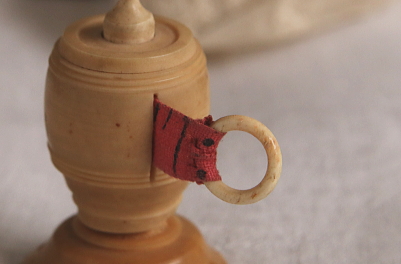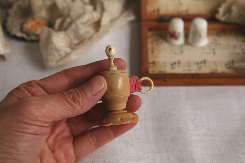 ★A&C16257 ベジタブルアイボリー スーベニールメジャー W3.5,D3.5,H6.3cm / ¥19,600.-〔税込み・送料別〕 送料:Aランク 【送料ページはこちら】 ◆ご注文方法はこちら◆ ベジタブルアイボリーの淡い褐色が優しく、小さく愛らしいフォルムに似合います。それよりやや白っぽい、ボーンのリングを引き出すと、ピンクファブリックに目盛りが書かれた、36インチまで測れるメジャーに。これもボーン製の巻き取りハンドルなど、ベジタブルアイボリーとの素材感の組み合わせ、ころりとしたフォルムが掌に収まる手触りも好ましい、手芸小物のコレクションに。1900年頃のイギリスから。 巻取りハンドルの穴に、観光地の写真が仕込まれたスタンホープだと思いますが、レンズや写真はなくなっています。脚の裏面に自然由来のヒビが見られ、わずかに表にでていますが、強度的にはしっかりしており気にならないと思います。 ベジタブルアイボリーやアイボリーの手芸小物をご紹介しています。ページ下部のリンクからご覧ください。 |