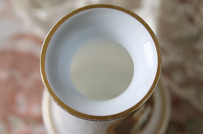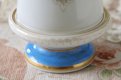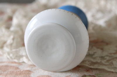 ★A&C16265 ミルクガラスのフラワーベース W6.7,H12cm / ¥7,600.-〔税込み・送料別〕 送料:Aランク 【送料ページはこちら】 ◆ご注文方法はこちら◆ 一見陶磁器に見えるけれど、より透明感を感じるミルクガラスのフラワーベース。ブルーの発色が鮮やかで、さりげない金彩も好ましい華やかさ。さてプリントの肖像の人物はよくある貴婦人とも思いましたが、ドレスの襟の形や刺繍、結い上げた髪型など何度も見返し、マリー・アントワネットではないかと思いましたがどうでしょうか、フラワーベースの可愛らしい雰囲気にも似合う愛らしい肖像です。20世紀前期のフランスから。 金彩に僅かにスレがみられる程度で、特に目立つダメージの見られない、きれいなしっかりした状態です。 背景に映るフォトスタンドや、可愛らしいムードのフラワーベースをご紹介しています。ページ下部のリンクからご覧ください。 |