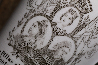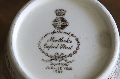 ★A&C16279 ヴィクトリア女王 ダイヤモンドジュビリー ビーカー MINTON W8.8,H9.7cm / ¥23,800.-〔税込み・送料別〕 送料:Aランク 【送料ページはこちら】 ◆ご注文方法はこちら◆ ヴィクトリア女王の戴冠60周年を記念する、ジュビリーアイテムの陶ビーカー。英国御用達の名窯MINTONが、当時ロンドンのオックスフォードストリートにあった高級陶磁器店Mortlock'sのために製造しました。美しく白い陶肌にライトグレーの転写プリントで、戴冠時、戴冠50周年、60周年と3つの時代の肖像を描き、裏面には女王陛下統治下の英国がもっとも繁栄した時代の様々な功績が列挙された、他に見ない特別な構成と言っていいでしょう。ダイヤモンド・ジュビリーアイテムのなかでも格別の存在感です。1897年製のヴィクトリアンアンティーク。 釉薬全体に貫入が見られ、内側と底に染みがあります。口縁に小さなヒビが1ヶ所ありますが、時代を考えれば全体にきれいな状態です。容量はすり切りで340ml程。 ヴィクトリア女王の記念アイテムや、息子のエドワード7世のコロネーショングラスをご紹介しています。ページ下部のリンクからご覧ください。 |