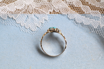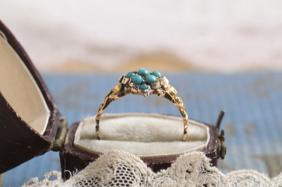 | ★A&C16305 ターコイズ クラスターリング Victorian サイズ9.5号(1.7g) / ¥143,000.-〔税込み〕 天然ターコイズ / K14ゴールド(フェイス) / K18ゴールド(ショルダー) / K6~14ゴールド(シャンク) 〔品質保証書付き〕 送料:宅配便送料無料(3万円以上) ◆ご注文方法はこちら◆ 優しいブルーが勿忘草を思わせるターコイズは、花言葉の「真実の愛」というロマンティックなメッセージを宿した、ヴィクトリア時代の代表的な宝石のひとつです。7粒のターコイズを集めて、小さな一粒一粒の色みの機微にも個性を感じる、アンティークならではの味わいです。ターコイズの脇には、繊細で華やかな透かしの彫刻を施して、裏には大切な品を収めることが出来る隠し窓を設えた、19世紀中期、ヴィクトリア時代のイギリス製。 特に目立つダメージの見られないきれいなしっかりした状態です。サイズ直しは有償にて承ります。お気軽にご相談ください。写真のケースは付属しません。 他にもターコイズやターコイズグラスを使ったジュエリーをご紹介しています。ページ下部のリンクからご覧ください。 |