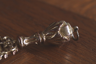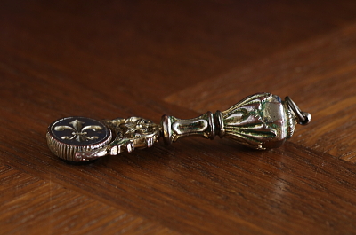 | ★A&C16309 薔薇と百合紋 フォブシール W27,D15,L68mm(マルカン含まず) (29g)/ sold 送料:Aランク 【送料ページはこちら】 定形外郵便対応【ご注文時にお申し付けください】 ◆ご注文方法はこちら◆ 片面は黒ガラスに薔薇模様、もう一方には百合紋が刻まれたフォブシール。注文品ではなく、元から模様の刻まれたアクセサリーのようなスーベニールだと思いますが、金色のメッキが施されたハンドルは、ところどころ摩滅して地金のキャストコッパーが顔を覗かせる、しっかりとした持ち重りとレリーフの美しさが魅力的です。薔薇と百合が回転する、動きのあるアクセサリーは、20世紀中期のヨーロッパから。 メッキの摩滅が幾らか見られますが、それ以外には、特に目立つダメージの見られないきれいなしっかりした状態です。 色入なスタイルのフォブシールをご紹介しています。ページ下部のリンクからご覧ください。 |