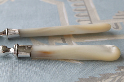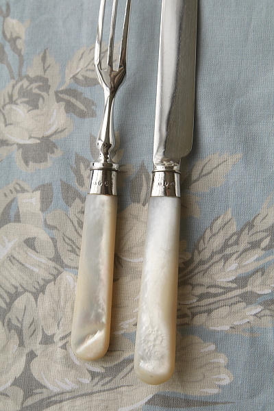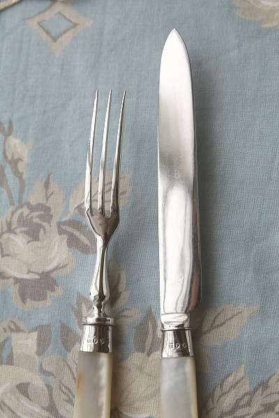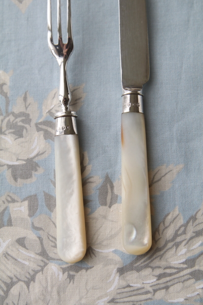 | ★A&C16310 エドワーディアン デザートナイフ&フォーク Richard Frederick Mosley & Sons A&C16310-A~C共: ナイフ:L18cm フォーク:L15cm / 各¥8,700.-〔税込み・送料別〕 A&C16310-D:(捲れ少し多め) ナイフ:L18cm フォーク:L15cm / ¥7,900.-〔税込み・送料別〕 A&C16310-E:(捲れ多め) ナイフ:L18cm フォーク:L15cm / ¥7,400.-〔税込み・送料別〕 送料:Aランク 【送料ページはこちら】 ◆ご注文方法はこちら◆ マザーオブパールのハンドルが手に優しい、デザートナイフ&フォークはイギリスから。シルバープレートのナイフやフォークに、細やかなエングレーヴィングで古典的な模様を彫刻する、輝きも豪華な小ぶりなカトラリー。ジョイントはスターリングシルバーで、誇らしげなホールマークも装飾に思えて魅力的。フルーツやパンケーキ、スコーンなどお茶の時間に重宝で華やかで、デザートカトラリーとしても比較的小ぶりなサイズが、日本人の手にフィットしてうれしい。刻印から1901年のイギリス、シェフィールドの工房、Richard Frederick Mosley & Sonsの作品と分かるエドワーディアンアンティーク。 何れもフォークにシルバープレートの捲れ、ナイフブレードの小キズ、ハンドルへの色づきが見られます。程度はそれぞれ違いますが、何れも使用上の問題はありません。 他にもマザーオブパールハンドルのこぶりなカトラリーをご紹介ししています。ページ下部のリンクからご覧ください。 |