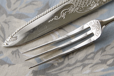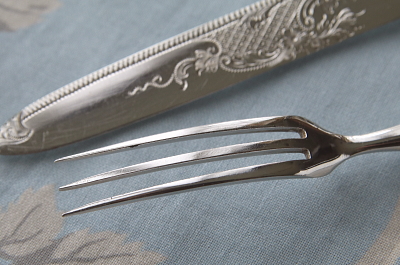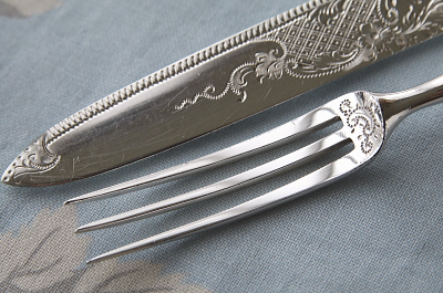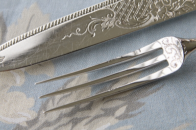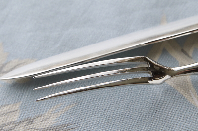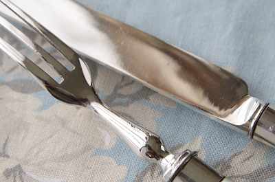 ![]() A&C16310-B: ナイフ:L18cm フォーク:L15cm / ¥8,700.-〔税込み・送料別〕 フォークにシルバープレートの捲れがわずかに見られます。 |