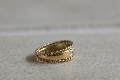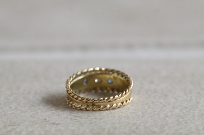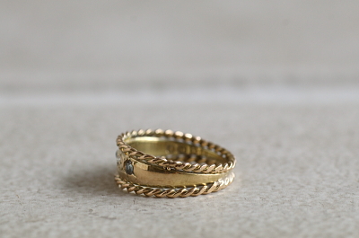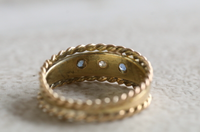 ★A&C16341 ダイヤ&ブルーサファイア ジプシーリング サイズ13号(4.0g) / ¥157,000.-〔税込み〕 天然ダイヤモンド / 天然サファイア / K18ゴールド 〔品質保証書付き〕 送料:宅配便送料無料(3万円以上) ◆ご注文方法はこちら◆ 真ん中にダイヤモンドと、両サイドにブルーサファイアを埋めた、ジプシーリングと呼ばれるスタイルのリング。ロープパターンのエッジが際だたせる、K18イエローゴールドフェイスに、透明感が美しいブルーサファイアと、全体の輝きを引き締めるのは、やはりダイヤモンドの煌めきです。フラットで引っかかりのないデザインの、着けやすさも魅力のひと品は、ホールマークから、1904年のイギリス、チェスター製と分かるエドワーディアンアンティークです。 特に目立つダメージの見られない、きれいなしっかりした状態です。サイズ直しは有償にて承ります。お気軽にご相談ください。写真のケースは付属しません。 他にも色石のジプシーリングをご紹介しています。ページ下部のリンクからご覧ください。 |