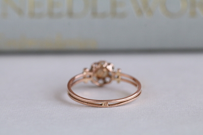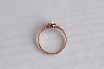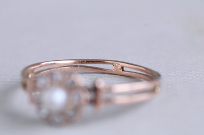 ★A&C16353 パール&ローズカットダイヤ デイジーリング サイズ16号(1.6g) / ¥190,000.-〔税込み〕 本真珠 / 天然ダイヤモンド / K18ゴールド 〔品質保証書付き〕 送料:宅配便送料無料(3万円以上) ◆ご注文方法はこちら◆ 中心にパールを据え、その周りを薄く透明なローズカットダイヤモンドの花びらで取り囲む小花の形をしたリング。ローズカットダイヤには、ブリリアントカットのようにパビリオン(後ろ半分の出っ張り)がなく、フラットにカットされている。カット面の少なさもあり、薄氷のように澄んだ輝きが、春にふさわしい爽やかな趣です。シャンクデザインも風通しの良い洗練された雰囲気で、あたたかみのあるローズゴールドの2重のラインが、パールの白さとダイヤモンドの個性的な輝きを、過不足なく受け止めてくれます。1900年頃のフランスから、百年を経て益々の洗練が感じられるリングです。 特に目立つダメージの見られない、きれいな状態です。サイズ直しは有償にて承ります。お気軽にご相談ください。写真のアンティークケースは付属しません。 パールリングほかアンティークジュエリーをご紹介しています。ページ下部のリンクからご覧ください。 |