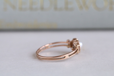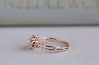 ![]() フェイスサイズは7.9×7.8ミリ。パールの直径は3.2ミリ。 ダイヤモンドはそれぞれの石の形に合わせてカットされた一石ずつ異なるローズカットです。 |