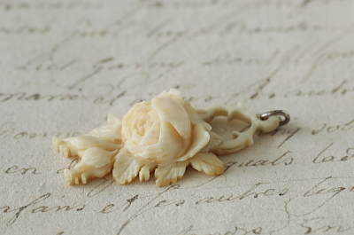 ★JW534-A モスローズのアイボリーペンダント W18.3×38.7mm(丸カン含まず)(2.5g) / sold 本象牙 送料:宅配便送料無料(3万円以上) ◆ご注文方法はこちら◆ 小ぶりで繊細な彫刻のモスローズ。厚みは9ミリと、このサイズで薔薇のボリュームある花弁の重なりを表現して、蕾や弦をデザインに巧みに取り込んでいます。上部に花弁の欠損が見られますが、モスローズの愛らしさは十分に保ちます。それ以外はしっかりした状態です。ネックレスチェーンは付属しません。 |