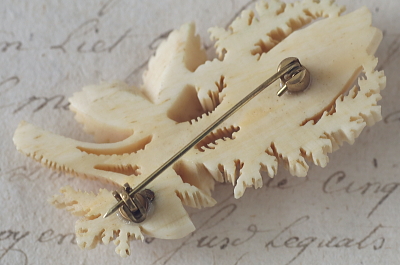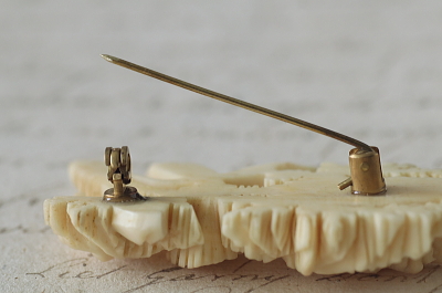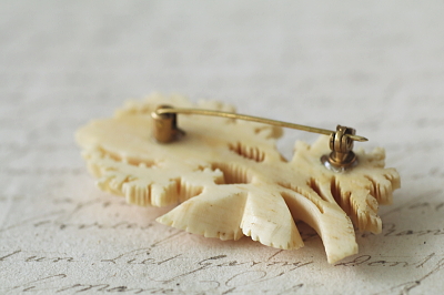 ★JW534-B モスローズのカーブドボーンブローチ W52×H30.5mm(9.6g) / ボーン 送料:宅配便送料無料(3万円以上) ◆ご注文方法はこちら◆ モスローズ特有の微細な腺毛に覆われて、今にも開花しそうな様子を彫り上げたブローチ。9.6ミリの厚みあるボーン材に表現した、巧みな彫刻が魅力的なひと品。特に目立つダメージの見られない、きれいなしっかりした状態も嬉しいです。落下防止にシリコンストッパーをお付けします。 |