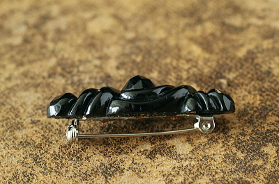★JW536-B ヴィクトリアンジェット バーブローチ W45.5×H10mm(4.4g) / ¥18,000.-〔税込み・送料別〕 天然ジェット 送料:Aランク 【送料ページはこちら】 定形外郵便対応【ご注文時にお申し付けください】 ◆ご注文方法はこちら◆ 硬いジェットに細やかな彫刻を施した繊細なデザインで、輝きも静かに艶やかに愉しめる。厚み7.3ミリとボリューム感も十分のひと品。裏の端に小さな欠けが見られますが、使用上気になるものでは有りません。落下防止にシリコンストッパーをお付けします。アンティークケースは付属しません。 |