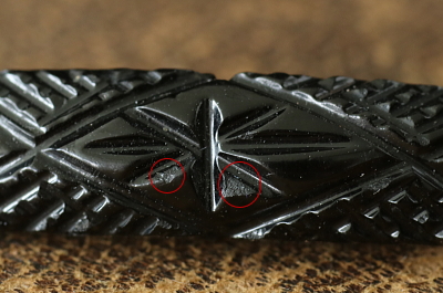 ★JW536-A ヴィクトリアンジェット バーブローチ 40.7×8.4mm(4.6g) / 天然ジェット 送料:Aランク 【送料ページはこちら】 定形外郵便対応【ご注文時にお申し付けください】 ◆ご注文方法はこちら◆ 真ん中と両端の、ローズカットのような彫刻が目を引きます。滑らかで深いツヤを愉しめるジェットならではの輝きです。厚みも10ミリとボリューム感のあるバーブローチ。金具が交換されており、裏面に金具を接着した跡がありますが、使用上気にならないと思います。それ以外は目立つダメージの見られない、きれいなしっかりした状態です。写真のアンティークケースは付属しません。 |