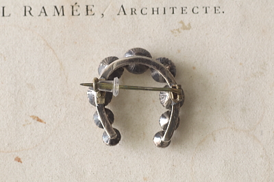 ★JW539-A ヴィクトリアン シルバーペーストブローチ・馬蹄 W27×H27.5mm(5.0g) / sold ガラス / シルバー 送料:宅配便送料無料(3万円以上) ◆ご注文方法はこちら◆ ユニークなカットの大粒クリアペーストを9石、馬蹄型に連ねた銀製のブローチ。幸運を呼ぶラッキーチャームとして、今も昔も好まれるホースシューのモチーフが、アンティークの質感と、十分な量感と共に愉しめる、ヴィクトリアンアンティークならではの風格あるブローチです。19世紀のヨーロッパ製。 刻印は有りませんがテスト済みのシルバー製。ペーストのファセットにスレが見られますが、大きな輝きに紛れてあまり分かりません。それ以外はしっかりした状態です。落下防止にシリコンストッパーをお付けします。 |