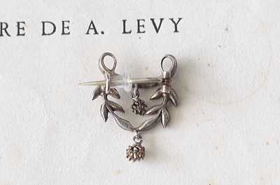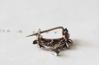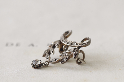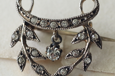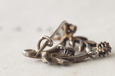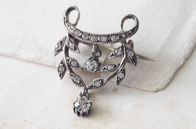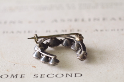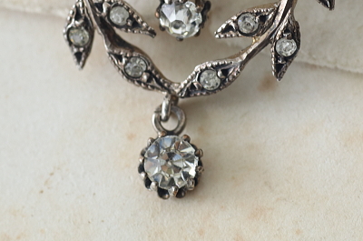 ★JW538-C エドワーディアン シルバーペースト ペンダントブローチ・オリーブガーランド W20.5×H27mm(2.8g) / sold ガラス / 800シルバー 送料:宅配便送料無料(3万円以上) ◆ご注文方法はこちら◆ シングルカットペーストが2粒揺れる、動きのある繊細なエドワーディアンスタイルのペンダントブローチ。オリーブの小枝などに飾られたペーストは小粒ですが、周りに刻まれた細やかなミル打ちも見事で、よりリアルなダイヤモンドジュエリーのようです。2箇所のループにネックレスチェーンを通してペンダントとしてもブローチとしても愉しめます。1900年頃のフランス製。 ペーストにスレが幾らか見られますが、肉眼で気になるものでは有りません。それ以外は特に目立つダメージの見られない、きれいなしっかりした状態です。落下防止にシリコンストッパーをお付けします。ネックレスチェーンは付属しません。 |