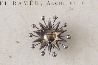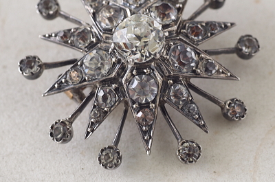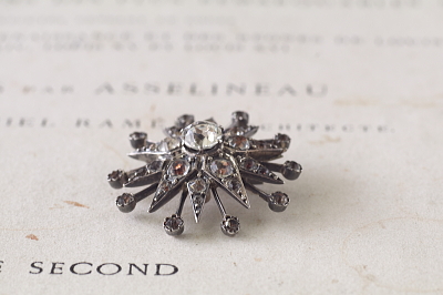 ★JW539-C ヴィクトリアン 星のペーストブローチ W31×31mm(8.3g) / ガラス / シルバー 送料:宅配便送料無料(3万円以上) ◆ご注文方法はこちら◆ エリザベス女王が晩年、身に着けていた星のダイヤモンドブローチもヴィクトリア時代の物といわれていて、八芒星の先端の間からスパークルが飛び出したようなデザインで少しこれと似ています。こちらは五芒星が二つ重なるようなデザインで、占星術的にも縁起のいいものらしいです。中央にはオールドマインカットのペーストを主役に置いて、周囲には、シングルカットのペーストを配しています。 刻印はありませんが、テスト済みのシルバー製。19世紀ヨーロッパ製です。 ペーストに僅かに欠けがあるものがありますが、肉眼では分からないレベルです。スパークルの飾りの軸部分に多少歪みがありますが、ほとんど分からず、気にならないと思います。全体的にしっかりした良い状態です。 |