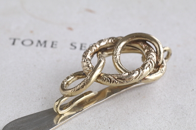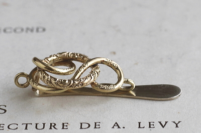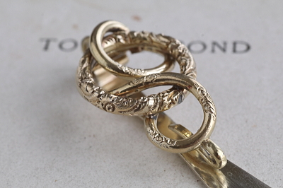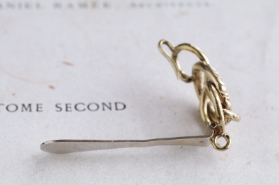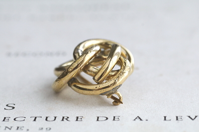 ★JW543 ヴィクトリアンラヴァーズノット シャトレーンフック&ブローチ 難解な知恵の輪や立体パズルを思わせる、解きようのない結び目の造形。ラヴァーズ・ノットと呼ばれる、ヴィクトリア時代に流行した、永遠の愛や絆を表すロマンティックなモチーフです。連続した滑らかな曲線と表面に刻まれたウロコにも見える彫刻が、ヘビの姿を想像させる一面もあり、これもまたヴィクトリア時代に流行した永遠の愛を意味するポジティブなモチーフ。デザインの美しさや完成度の高さは大前提としたうえで、この時代のひとつの特長である、堂々として甘やかさのない、ともすれば無骨にも感じる好き嫌いの分かれるテイストですが、そんなロマンティックな思いを込めて贈られたものと知れば、少々過剰気味のボリュームも思いの丈を表したものと、がぜん愛おしくなってきます。酸いも甘いも噛み分けてきた大人にこそ似合う、最上級の甘いメッセージを秘めたジュエリーなのです。 今回のご紹介は、フランス製ベルメイユのシャトレーンフックと、イギリスのゴールドトーンメタルのブローチ。いずれも19世紀の品です。 |