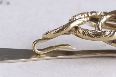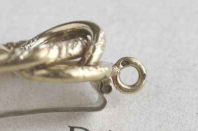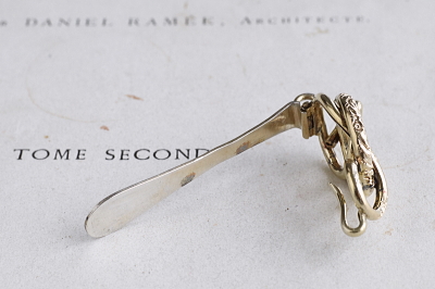 ★JW543-A ヴィクトリアンラヴァーズノット シャトレーンフック W20,D,14.5,H59mm(10.2g) / 800シルバー 送料:宅配便送料無料(3万円以上) ◆ご注文方法はこちら◆ 繊細な造形に細かな彫刻が施された、シルバー製のシャトレーンフックは、鍍金が施された華やかなベルメイユ。結び目部分だけでなく、ベースのプレートもベルメイユですが、金はほとんど剥がれています。シルバーゆえプレートに少々キズ、歪みが見られますが、全体にきれいなしっかりした状態です。19世紀のフランス製。 写真のアンティークケースは付属しません。 |