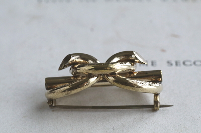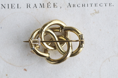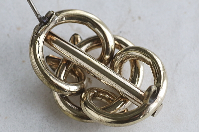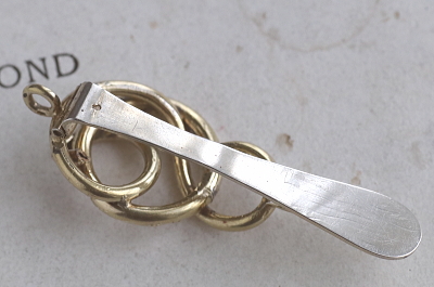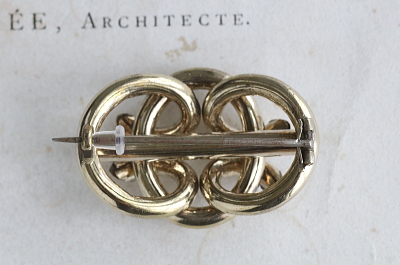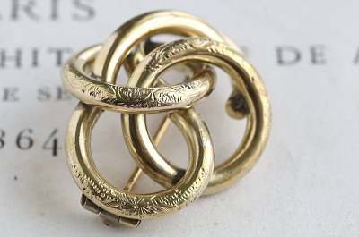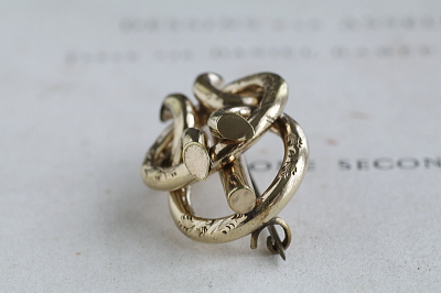★JW543-B ヴィクトリアンラヴァーズノット ゴールドトーンブローチ 中 W34.8×H28.8mm(9.3g) / ¥20,000.-〔税込み・送料別〕 合金 送料:Aランク 【送料ページはこちら】 ◆ご注文方法はこちら◆ 厚み11.4ミリと立体的に造形された、小作りで複雑な結び目が魅力的なブローチ。ゴールドトーンのメタルは、自然で豊かな金色が好ましい。わずかに半田のような汚れが付着して取れませんが、あまり目立たず使用上気にならないと思います。それ以外は全体にきれいなしっかりした状態です。19世紀のイギリスから。 落下防止にシリコンストッパーをお付けします。写真のアンティークケースは付属しません。 |