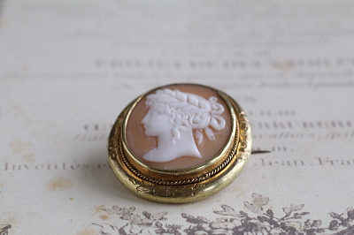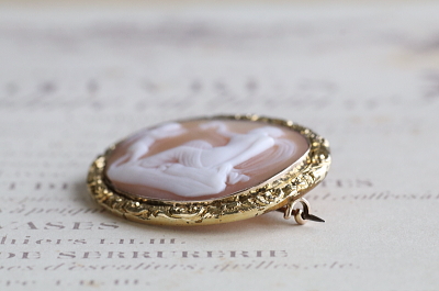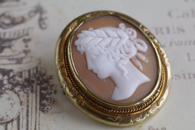 ★JW544 ヴィクトリアンシェルカメオブローチ 神々の肖像 古代ギリシャ・ローマ神話にテーマを求めたのは、この時代のひとつの特徴で、トリュフでは20世紀のヴィンテージのカメオも扱っていますが、20世紀も中期になってくるとモチーフはたいてい貴婦人。誰かの恋人、奥様。私自身に見立てた、身近な肖像が圧倒的に多くなる。カメオ自体もイタリア土産だとか、ちょっとしたギフトとして手軽に流通するようになっただろうし、手頃な価格に見合った仕上がりのものが多いので、良質な作品は少なく、結構苦労して選んでいます。 今回ご紹介する3点は、どれも19世紀ヴィクトリア時代の作品で、正直、彫刻は、目を見張るようなクオリティーではないものの、この時代特有の落ち着いた品のある表現で、いずれも神話のモチーフを描いている。そして、何より枠がいい。この時代らしい、クラシックで様式的なフレームは、カメオを十二分に受け止めて、ゴールドさながらの上品な輝きは、百年以上後の今も保たれています。 余白部分に数本ストレスラインが見られますが、目立たずあまり気にならないと思います。ストレスラインは、経年の温度や乾燥などが原因と言われ、ヒビとは区別されています。アンティークシェルカメオにはよく見られ、光を透かさなければわからない程度で、深刻なダメージではありません。 |