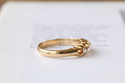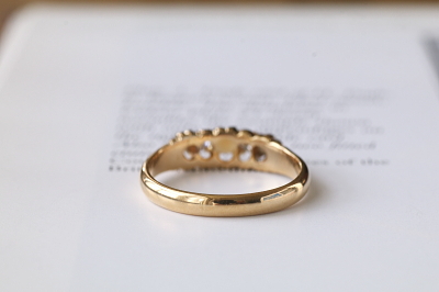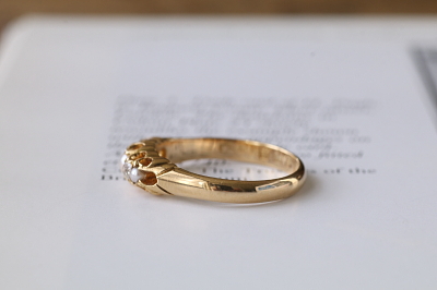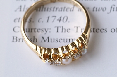 ★JW547 パール&オールドマインカットダイヤモンド ファイブストーンリング サイズ13号(3.4g) / 本真珠 / 天然ダイヤモンド / K18ゴールド 〔品質保証書付き〕 送料:宅配便送料無料(3万円以上) ◆ご注文方法はこちら◆ K18の厚くしっかりしたゴールドシャンクで支える爪の先に、ダイヤとパールが交互に5石セットされたヴィクトリアンリング。この時代の王道的なデザインともいえるファイブストーンタイプだけれど、このデザインで意外とパールとダイヤの組み合わせは珍しく、色石を使わないシックなカラーリングが、ラグジュアリーなムードを醸してくれます。ダイヤは四角っぽいクッションシェイプ気味のオールドマインカット。半分に削られたハーフパールたちに挟まれるようにして、白い輝きの連続が心地よいひと品。ホールマークが、今もしっかり判読できる1890年の英国チェスター製です。 とくに気になるダメージのないきれいなしっかりした状態です。 |