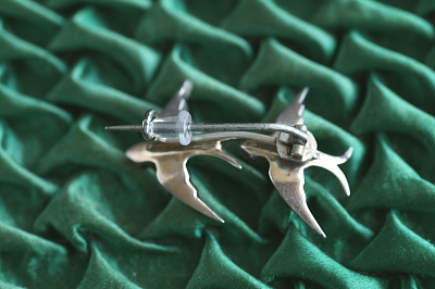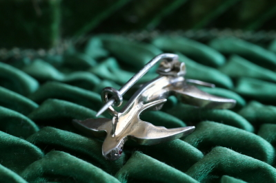 ★JW552D 2羽のつばめ ペーストシルバーブローチ 33×23mm (5.4g) / sold ガラス / シルバー 送料:宅配便送料無料【3万円以上】 ◆ご注文方法はこちら◆ 2羽のつばめが、前と後ろに繋がるように近づいて飛ぶ、小さな銀のブローチ。恋人か親子か、兄弟か。2羽の親密さがうかがえる愛らしい姿です。目にはルビー色のカボションペーストを、体にはいびつなオールドカットのクリアペーストを飾って、おとぎ話の世界から飛び出してきた、小さな宝物みたいです。近頃はこうした古い時代のペーストのシルバージュリーもどんどん少なくなって、デザインの魅力的なものは尚更見なくなりましたので、ぜひご紹介できているうちにどうぞ。19世紀のヨーロッパ製。 全体に金メッキが施されていたようですが、裏に薄く残っているだけで、ゴールドはあまり感じられません。ペーストのファセットの擦れなどは、ルーペでは確認できますが、肉眼ではまずわからない程度で、とくに気になるダメージのないきれいなしっかりした状態です。刻印などはありませんが、テスト済みのシルバー製。落下防止にシリコンストッパーをお付けします。 |