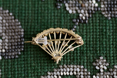 ★JW552J ガーネットペースト 扇のブローチ 30×22mm(3.2g) / ¥12,400.-〔税込み・送料別〕 ガラス / 真鍮 送料:Aランク 【送料ページはこちら】 定形外郵便対応【ご注文時にお申し付けください】 ◆ご注文方法はこちら◆ ボヘミアンガーネットに似せた、暗い赤のペーストを連ねた扇形のブローチ。19世紀後期のジャポニスムの影響を受けたものでしょう、長くはみ出たピン先が時代を表しています。宝石を使った高価なジュエリーだけじゃなく、ガラスのイミテーションで大衆にまで普及した日本贔屓のムードが、日本人としてはちょっと誇らしくも感じる、ヴィクトリア朝時代の英国のチャーミングなアクセサリーです。19世紀ボヘミア製。 ペーストのファセットの擦れなどは、ルーペでは確認できますが、肉眼では気にならない程度で、とくに気になるダメージのないきれいなしっかりした状態です。落下防止にシリコンストッパーをお付けします。 |