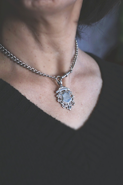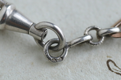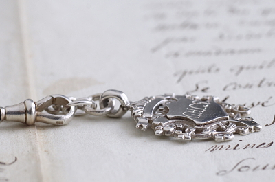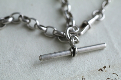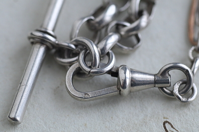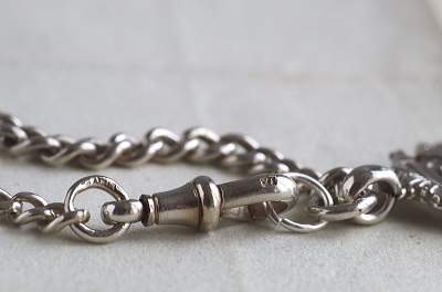 ★JW555A ヴィクトリアン シルバーアルバートチェーン L36mm (42.9g) / sold 925シルバー 送料:宅配便送料無料【3万円以上】 ◆ご注文方法はこちら◆ 19世紀ヴィクトリア時代、英国紳士の大切なポケットウォッチを繋ぎ留めていた、頑丈なウォッチチェーン。女王の夫であるアルバート公の名から、アルバートチェーンと呼ばれました。線径1.5ミリ、チェーン幅が最大7.5ミリの頼もしいウォッチチェーン。両端のスイベルクラスプとフォブメダルのリングを繋ぎ合わせれば、36センチと、チョーカーネックレスサイズになります。ゴツめのキヘイチェーンはちょっとフェティッシュな魅力もあり、近頃流行りのTバートップは、クールでカッコよく、デザインの良いフォブメダルの横にスイベルクラスプが並ぶ姿もおしゃれで、リバーシブルで楽しめます。メダルの裏に1897年バーミンガムのホールマークが。チェーン1コマ1コマに全てにライオンパサントが打たれた、スターリングシルバー製。贅沢に43gもあるので、重めが好きか、平気な方に。百年を経て、 きれいなしっかりした状態で残っています。 |