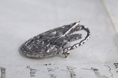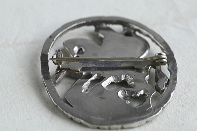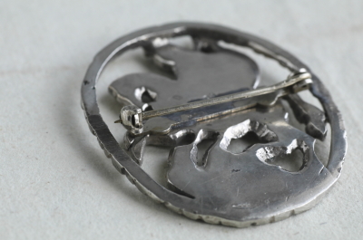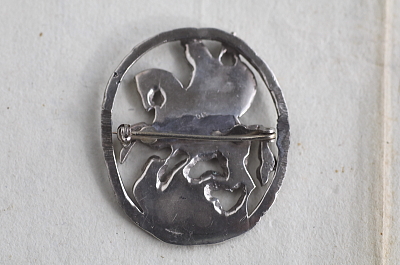 ★JW555B セント・ジョージ シルバーブローチ 37×43mm (16.9g) / ¥25,000.-〔税込み・送料別〕 シルバー / 合金ピン 送料:Aランク 【送料ページはこちら】 ◆ご注文方法はこちら◆ ドラゴンを今まさに追い詰めんとする馬上の棋士。この勇壮なシーンはセント・ジョージの伝説を描いています。セント・ジョージはイングランドの守護聖人で、イングランドの白地に赤い十字架の旗は、セントジョージズクロスと呼ばれます。 銀の鋳造でできたオーバルのフレームからセント・ジョージの勇敢な姿が飛び出すように、立体的にロウ付けされていて、躍動感のある表現です。ソリッドシルバーのずっしりとした重みとボリュームは、この季節にはジャケットやコートの襟に。英国贔屓の誰かへのプレゼントにも最適です。おそらくは1900年頃の品と思われるヨーロッパ製。 裏面の一部隠れている刻印は800シルバーを表していると思われますが、テスト済みのシルバー製。裏に何かを削り取った痕と、メタル素材のピン金具をはんだ付けしているのが認められ、本来はブローチではなく、何かをブローチにリフォームした物と思われます。 とくに気になるダメージのない、きれいなしっかりした状態です。落下防止にシリコンストッパーをお付けします。 |